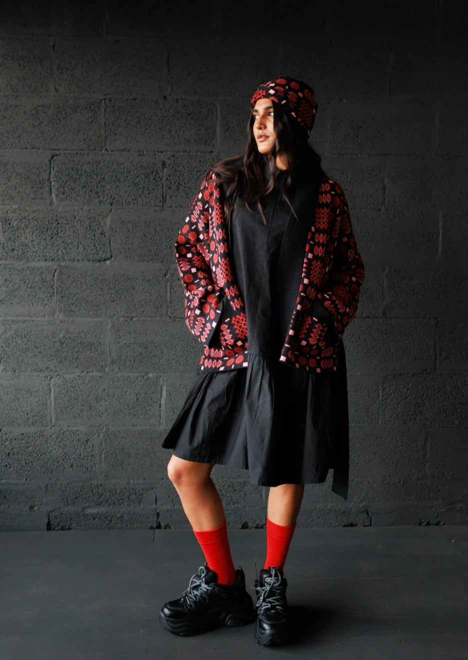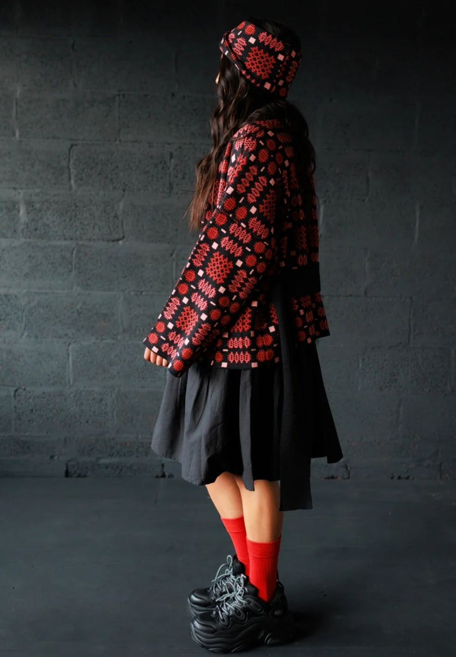 A relaxed kimono style cardigan, knitted in a Welsh Tapestry-inspired jacquard in a compact medium weight. With a detachable belt for versatility.