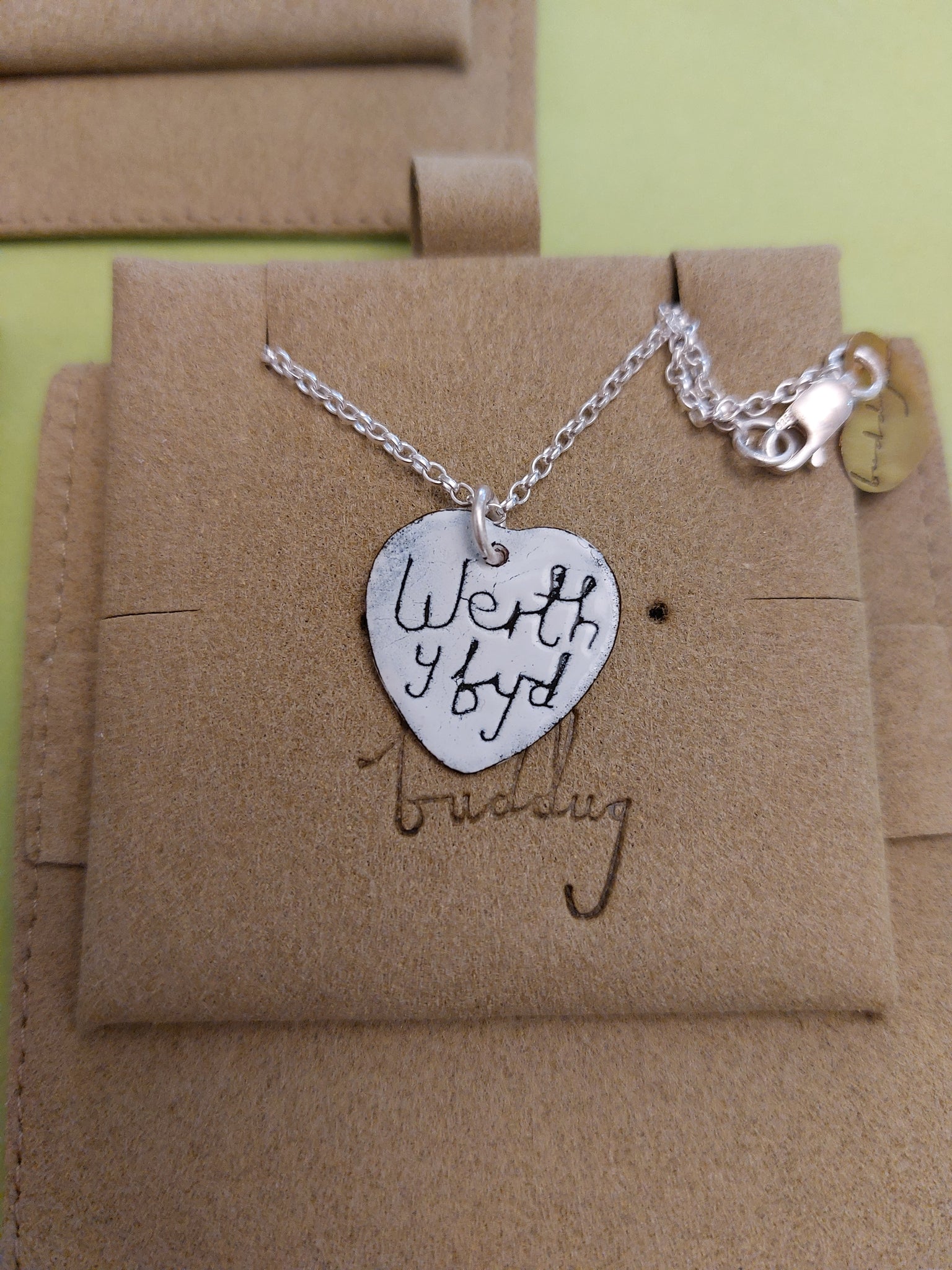 Each heart is individually enamelled and kiln-fired, in Buddug's studio, meaning no two pieces are exactly the same. Small marks and subtle variations are part of the process, adding character and making every necklace unique.